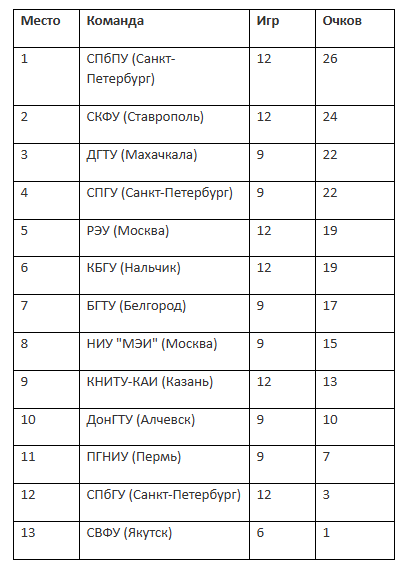 КБГУ (Нальчик) после двух побед подряд сыграл вничью (1:1) с одним из аутсайдеров турнира ПГНИУ (Пермь). Пермяки увезли из Казани четыре очка, «московские «энергетики» - шесть. Казанский КНИТУ-КАИ проиграл все три матча и выше итогового девятого места уже не поднимется.